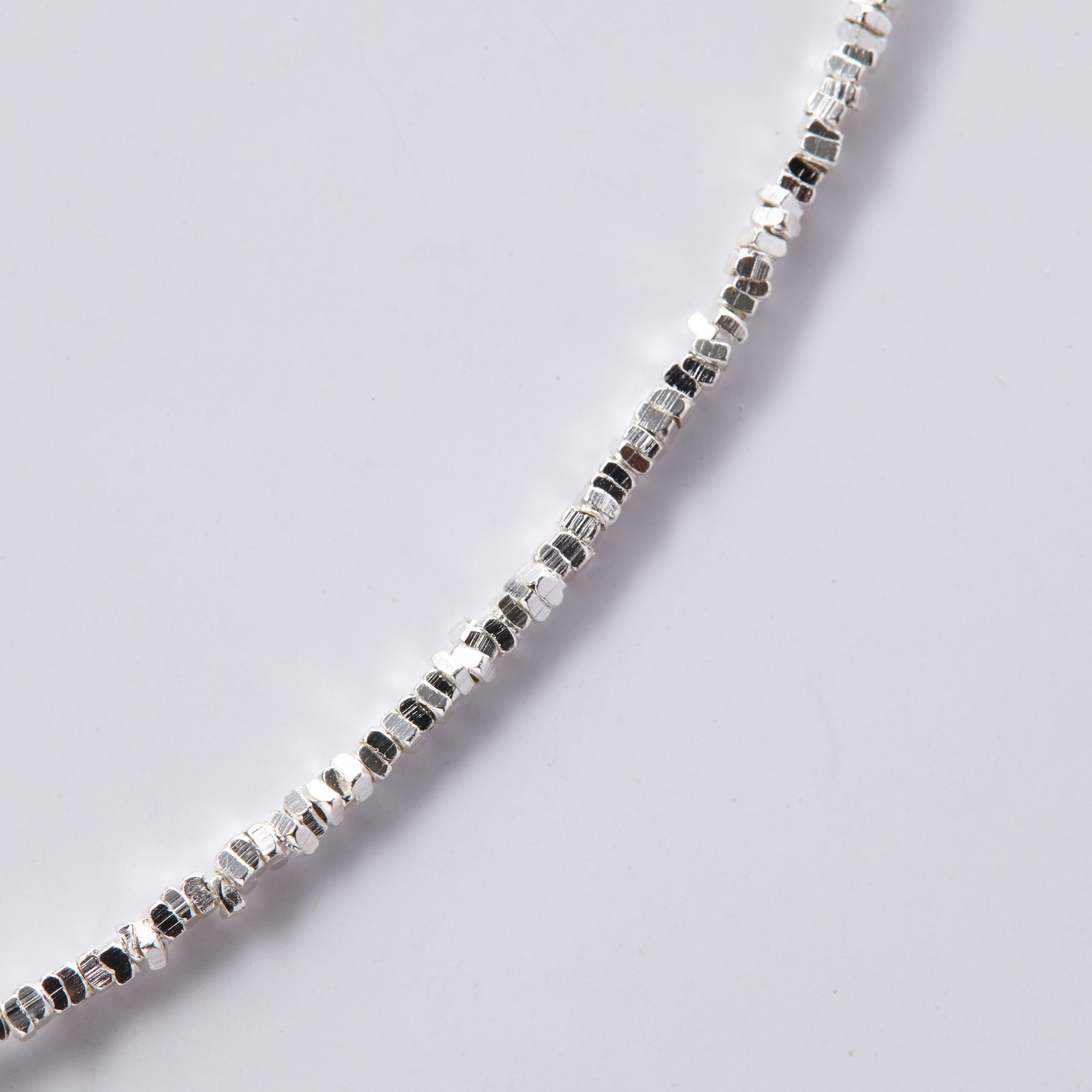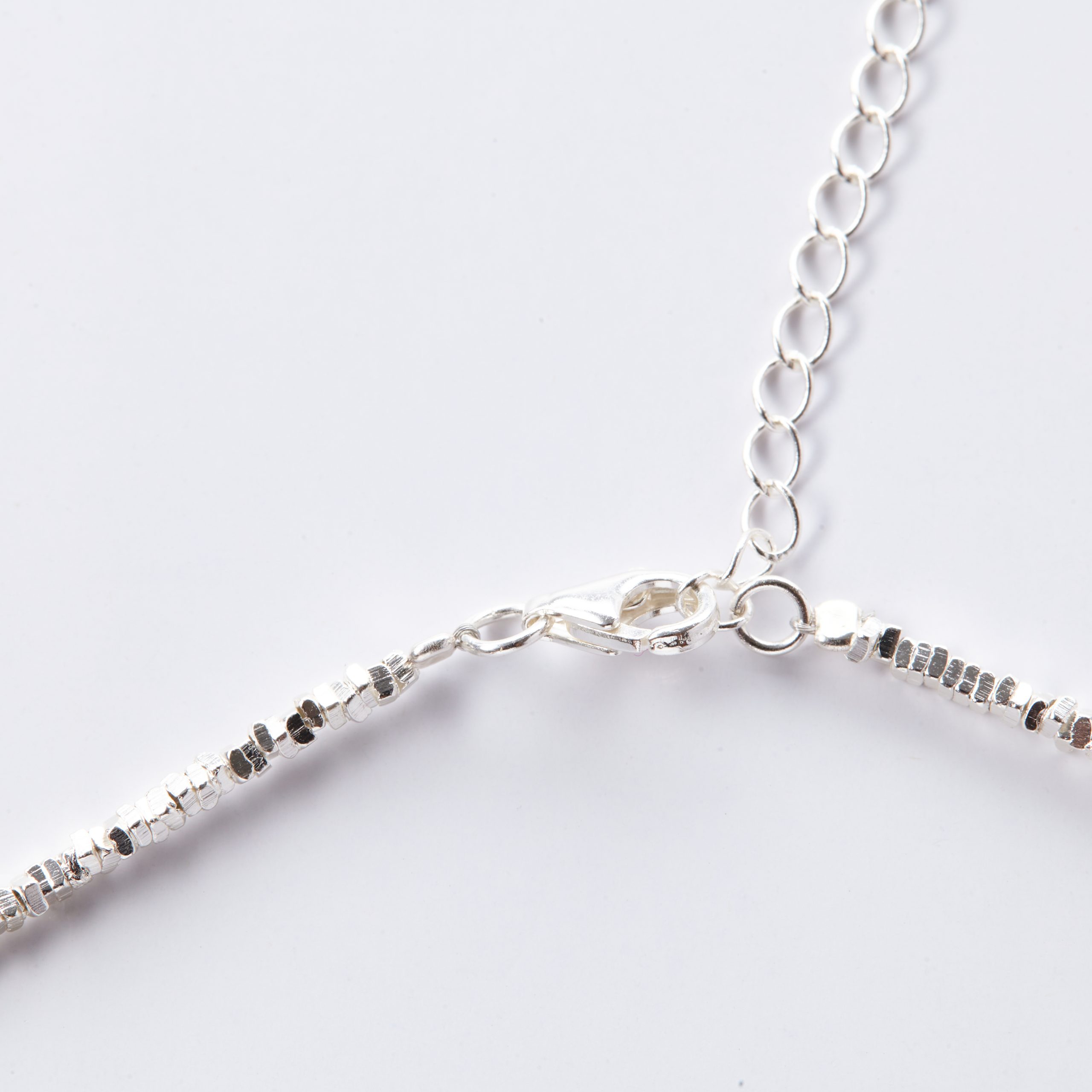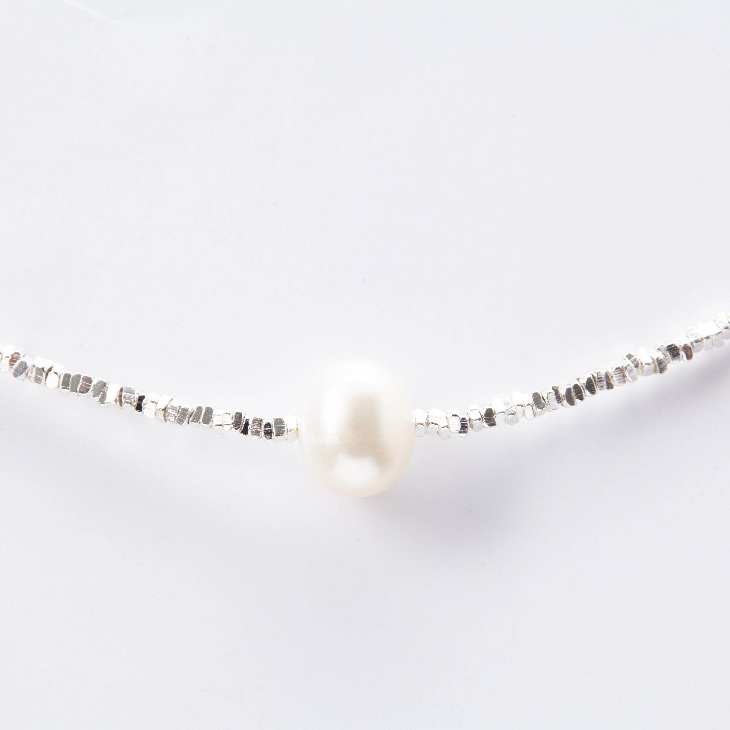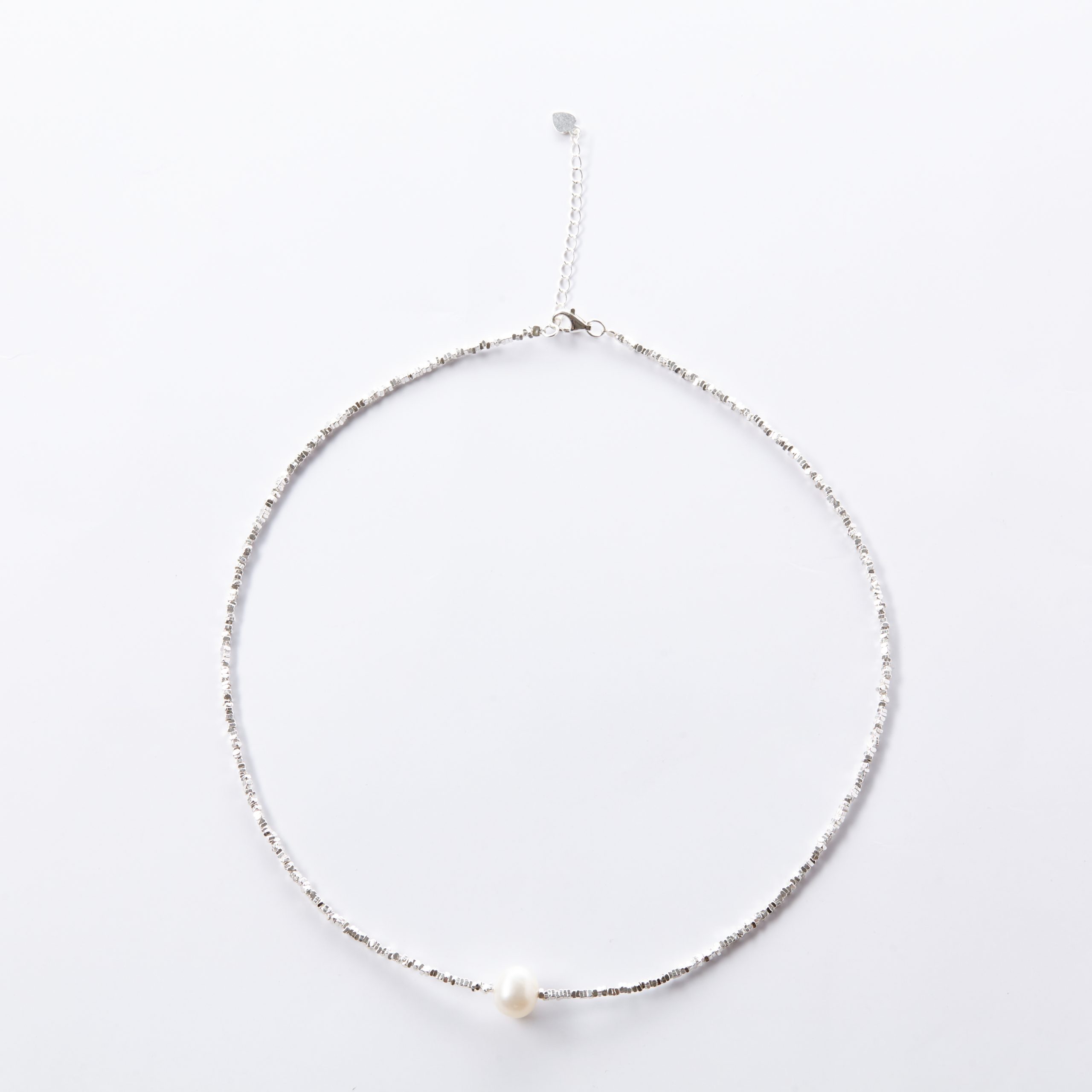 The Celine necklace combines rustic charm with timeless elegance. Made from small silver pieces, it creates an authentic and handmade feel. At the center of the necklace rests a natural white freshwater pearl, adding a touch of subtle luxury. Its mix of materials and textures gives it a unique and personal touch.